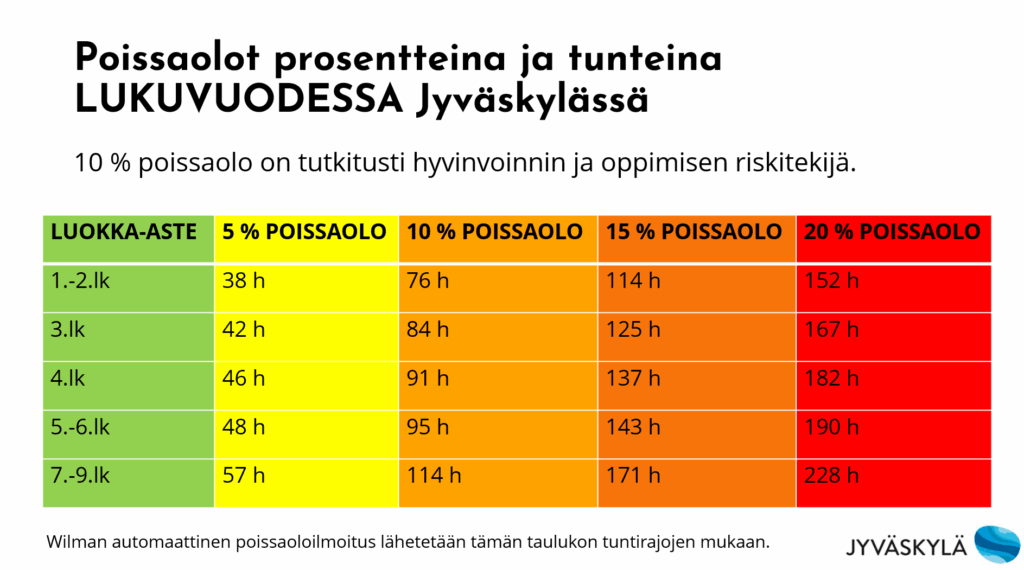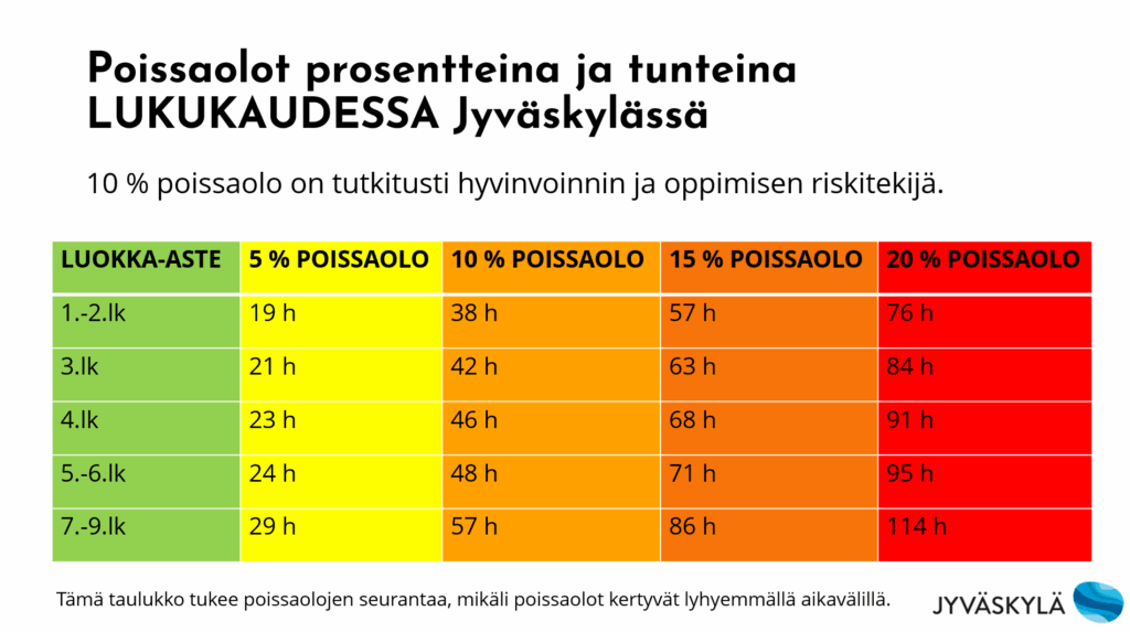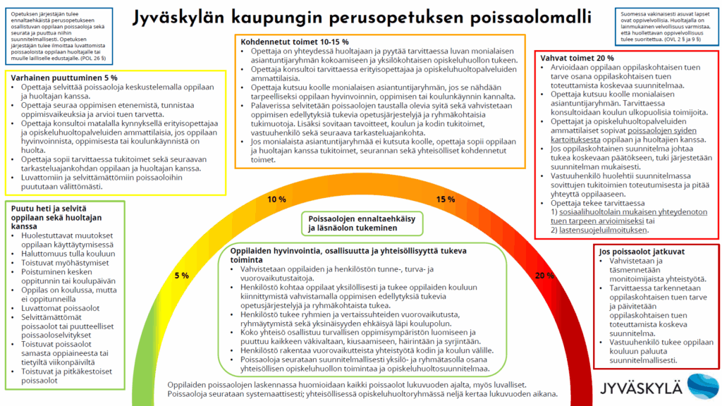 Jyväskylän perusopetuksen kouluilla otettiin käyttöön poissaoloihin puuttumisen toimintamalli 1.8.2021. Mallin tavoitteena on ennaltaehkäistä koulupoissaoloja, tukea kouluun kiinnittymistä ja tehostaa varhaista puuttumista poissaoloihin siten, että koulupudokkuuden riski vähenee. Ennaltaehkäisevä toiminta tukee oppilaiden osallisuutta, yhteisöllisyyttä ja hyvinvointia. Kouluun kiinnittymistä tuetaan läpi lukuvuoden jatkuvalla ryhmäytymisellä, tunne- ja vuorovaikutustaitojen vahvistamisella, oppilaan yksilöllisellä kohtaamisella sekä positiivisen palautteen antamisella.